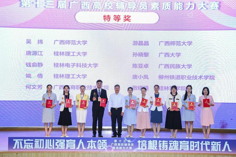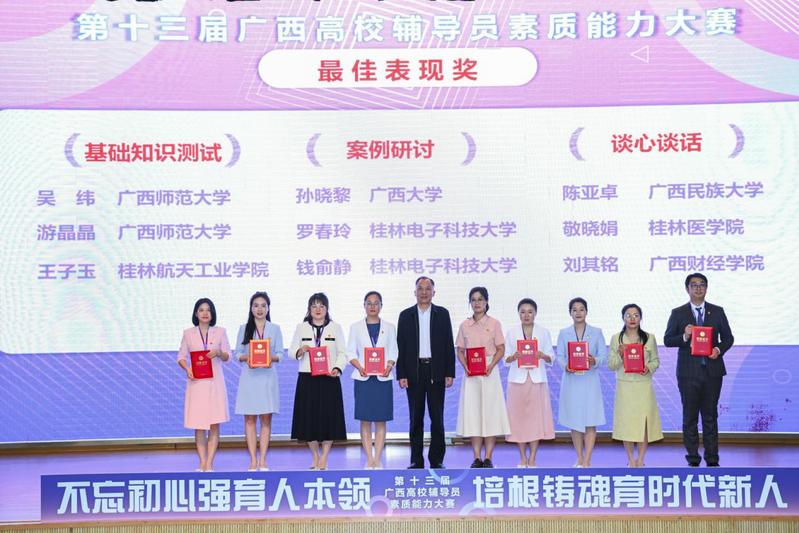4月18日至20日,由广西壮族自治区教育厅主办,教育部高校思想政治工作队伍培训研修中心(广西师范大学)承办的第十三届广西高校辅导员素质能力大赛在我校顺利举行。4月20日下午,自治区党委教育工委宣传部部长、教育厅思政处处长、二级巡视员赵益真参加颁奖仪式并致辞,我校党委副书记旷永青参加颁奖仪式并宣读获奖选手名单。来自全区79所高校的108名辅导员参加了比赛,吸引了300余名辅导员现场观摩学习,参赛人数和观摩人员规模均创历史新高。