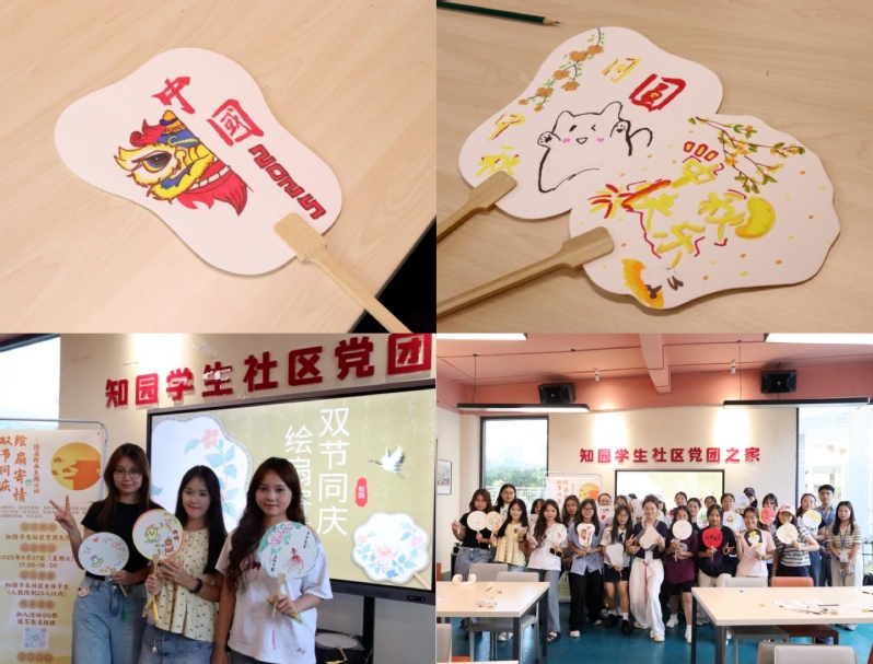 9月27日下午,知园学生社区开展“双节同庆,绘扇寄情”主题活动。同学们在了解节日文化与团扇历史后,亲手绘制以国庆、中秋为主题的创意团扇。现场创作氛围热烈,欢声笑语不断,大家在传统艺术体验中抒发了家国情怀,感受了双节的喜庆与温馨。