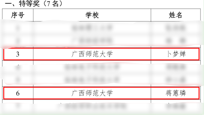 根据《自治区教育厅关于公布2025年广西高校大学生心理健康教育课教师教学能力大赛获奖名单的通知》(桂教思政[2025]20号),我校参赛教师卜梦婵、蒋蕙璘在2025年广西高校大学生心理健康教育课教师教学能力大赛中双双荣获特等奖。