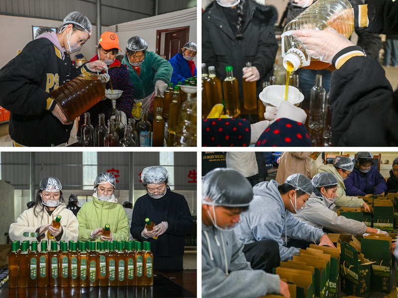 走进农产品加工车间,另一番热火朝天的场景正在上演。大家严格遵循食品生产卫生规范,分工开展山茶油灌装、包装盒组装、成品装盒等工序。从校准灌装机刻度确保计量精准,到折叠纸盒、粘贴标签力求规范美观,再到将封装好的茶油礼盒整齐装箱,每个环节都有条不紊。