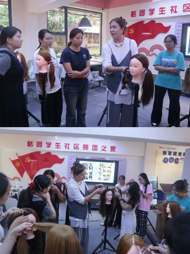 王老师从最基础的两股辫编法入手,耐心讲解了编发的核心技巧。随后,她现场演示了如何将基础编发技巧应用于日常,快速打造出几款简约而时尚的生活发型,激发了同学们的浓厚兴趣。
