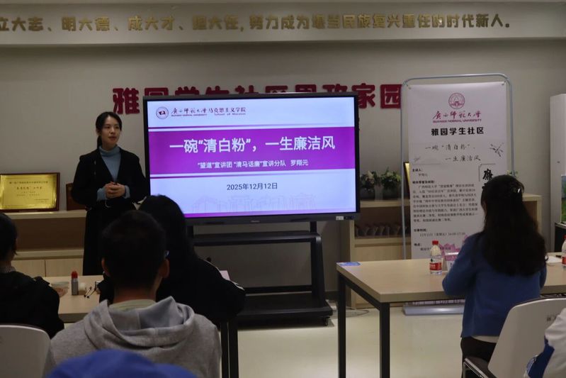 12月12日下午,雅园学生社区思政家园内氛围庄重而温馨。本期“社区素质课堂”以“一碗‘清白粉’,一生廉洁风”为主题,将廉洁教育与文化实践相结合,通过柳州螺蛳粉产业发展背后的清廉故事分享与“清廉”主题拓印活动,引导同学们在倾听与体验中筑牢廉洁意识,涵养清风正气。