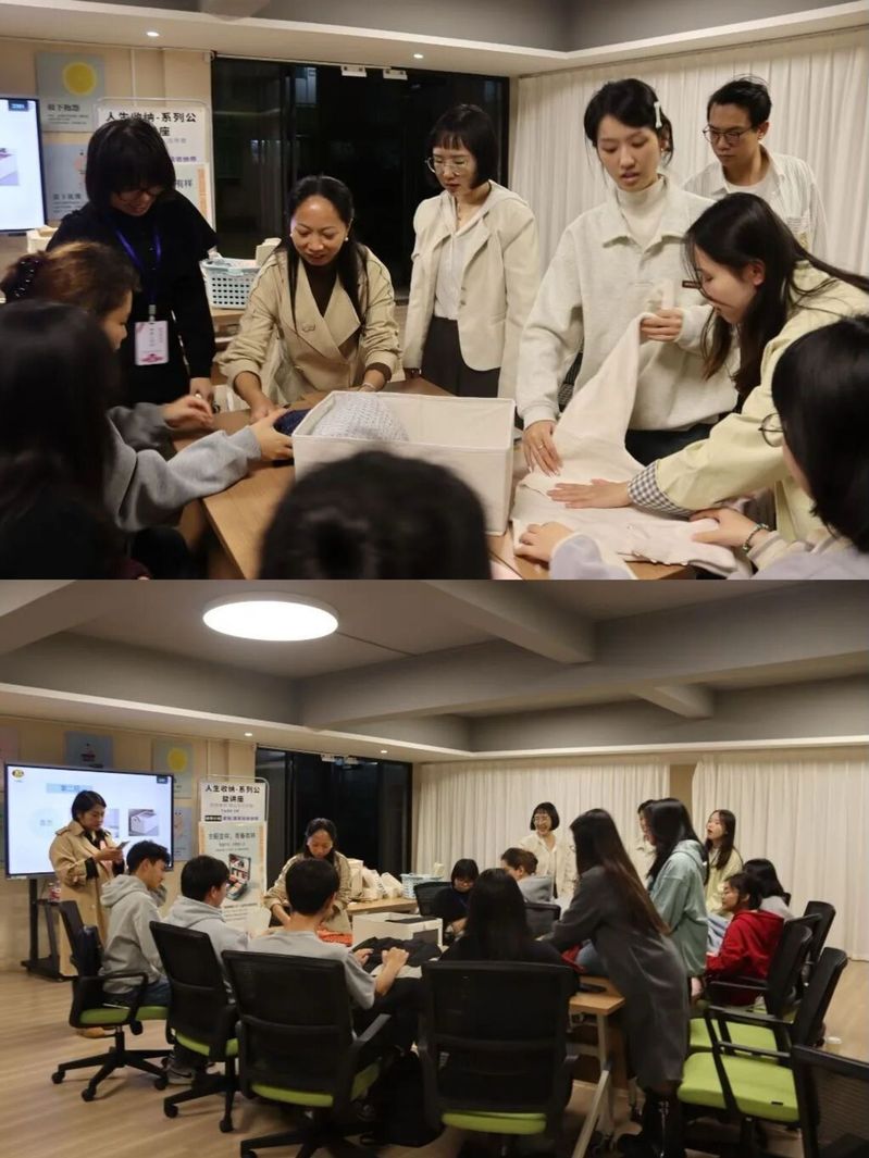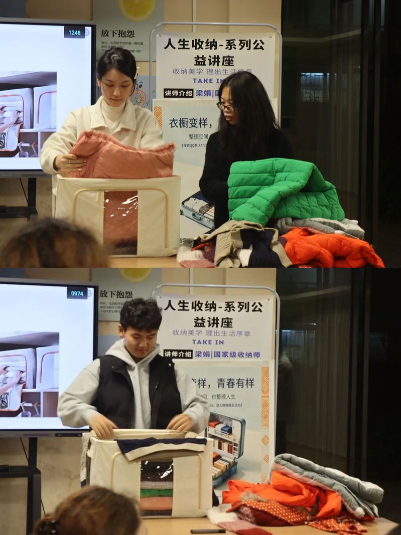 理论分享后,梁娟老师聚焦学生宿舍场景展开衣橱整理教学:她拆解了无效整理的常见误区,结合学生宿舍衣柜的实际尺寸,讲解了适配的分区布局与工具选择,并现场演示衣物折叠、收纳箱使用等实操技巧。同学们同步参与练习,在互动中掌握了宿舍场景下的整理要点。
