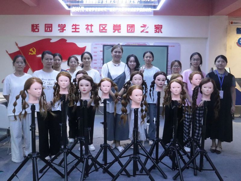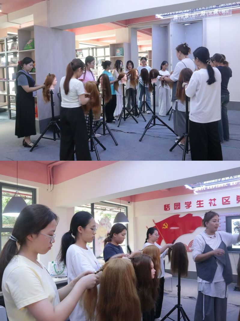 在实践环节中,同学们在王老师的悉心指导下,纷纷拿起工具与假发头模进行动手操作。大家互相交流、彼此帮助,现场气氛活跃。经过一番努力,每位同学都成功完成了自己的编发作品,在亲身实践中感受到了手工创造带来的成就感与美的浸润。