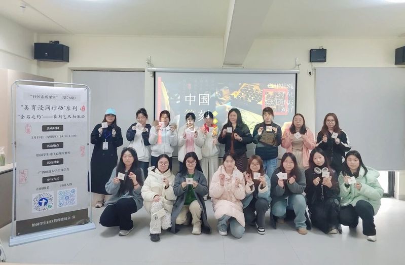活动最后,大家手持自己的篆刻作品与王老师合影留念,为这次“金石之约”画上圆满句号。下一步,“社区素质课堂”将持续围绕“美育浸润系列”主题,开展更多形式多样、内容丰富的分享活动,为同学们提供丰富的文化滋养,助力同学们身心全面发展。