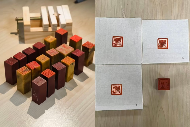 在活动体验环节,同学们跟随王老师的指导,拿起刻刀,从最基础的横、竖线条开始练习,逐步熟悉运刀的力度与节奏。待手法稍显熟练后,大家便开始尝试刻制自己的第一枚印章。王老师耐心地在同学们身边来回指导,逐一纠正姿势、解答疑惑。现场刻石声此起彼伏,气氛专注而热烈。经过一番精心雕琢,一枚枚初具形态的印章陆续完成,当同学们蘸上朱红印泥、郑重地将作品钤盖在宣纸上时,脸上洋溢着满满的成就感。