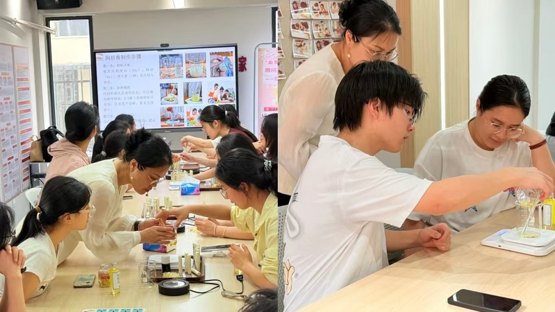 在理论讲解环节,主讲人围绕“唇间豆香,手作润色”这一主题,从咖啡豆唇膏的灵感来源、天然原料的选取标准、在制作过程中的安全注意事项,到完整的操作流程,逐一进行了系统讲解。她重点剖析了咖啡香气与唇部滋润功能的融合方式,并强调了手工制作中卫生把控与原料配比的重要性,帮助同学们建立起从材料准备到成品成型的整体认知。