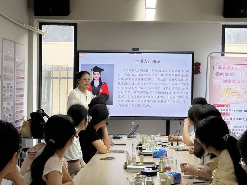 为深入推进“美育浸润行动”,近日,“社区素质课堂”(第八十四期)主题分享在育才校区学生社区党团之家如期举行。本次活动邀请到职业技术师范学院旅游管理系主任邓敏教授担任主讲,吸引了众多同学前来体验。