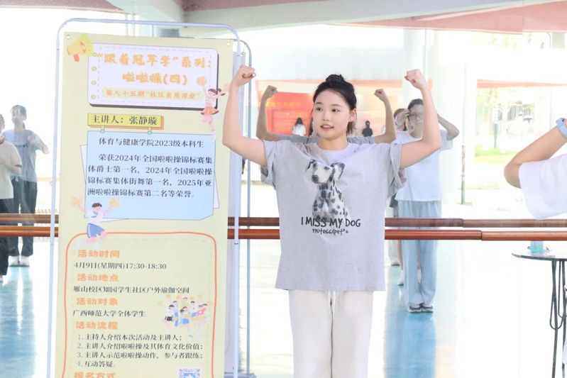 为落实“健康第一”育人理念,进一步推动“体质提升专项行动”,近日,“社区素质课堂”(第八十五期)主题分享活动在知园学生社区户外瑜伽空间火热开展。本次活动邀请到体育与健康学院2023级本科生谢静璇担任主讲人,她带领社区同学们沉浸式体验啦啦操的独特魅力。