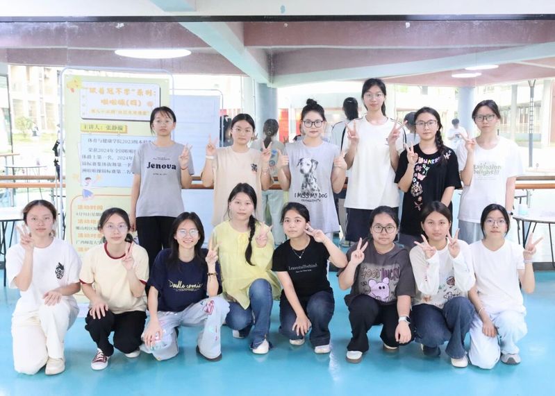 在动作讲解环节,主讲人从基础站姿与身体重心控制入手,逐一示范了啦啦操的手臂摆动角度、膝盖缓冲技巧以及步伐衔接要点。她将整套动作拆解为若干小节,强调手臂发力需干脆利落、脚步移动要稳中有序。同学们跟随口令反复练习,从起初的生涩卡顿到逐渐掌握发力节奏。随着音乐响起,大家互相打气、大胆跟跳,把零散动作融会贯通成一气呵成的律动,现场气氛热烈,欢笑声与节拍声此起彼伏。