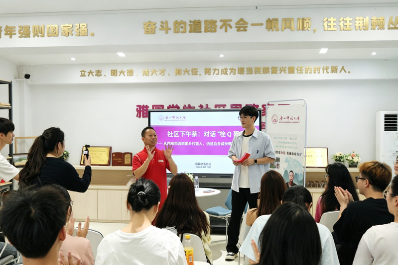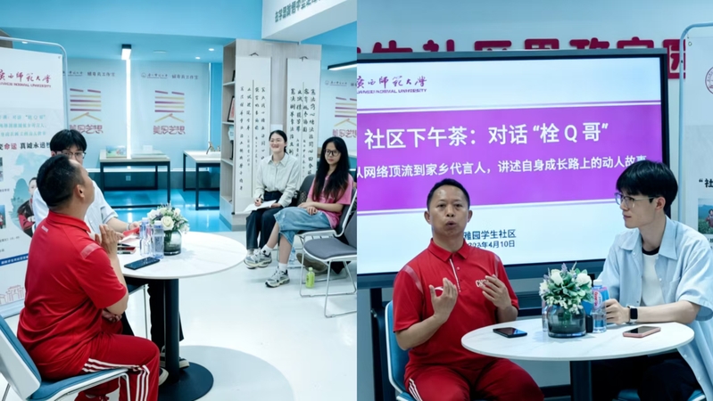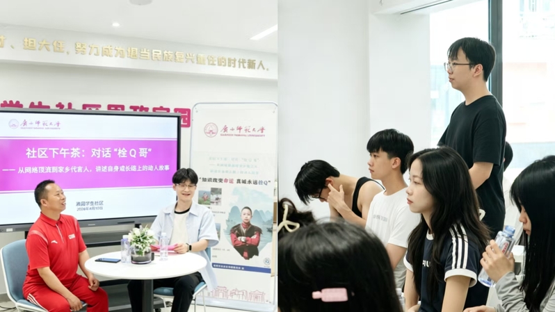 为激发学生发展的内驱力,近日,雅园学生社区“社区下午茶”活动在思政家园开展。阳朔县旅游形象大使、全网粉丝近500万的“栓Q哥”——刘涛老师应邀做客,与师大学子展开了一场关于坚持、热爱与家乡情怀的深度对话。