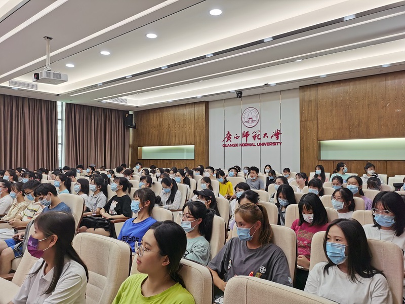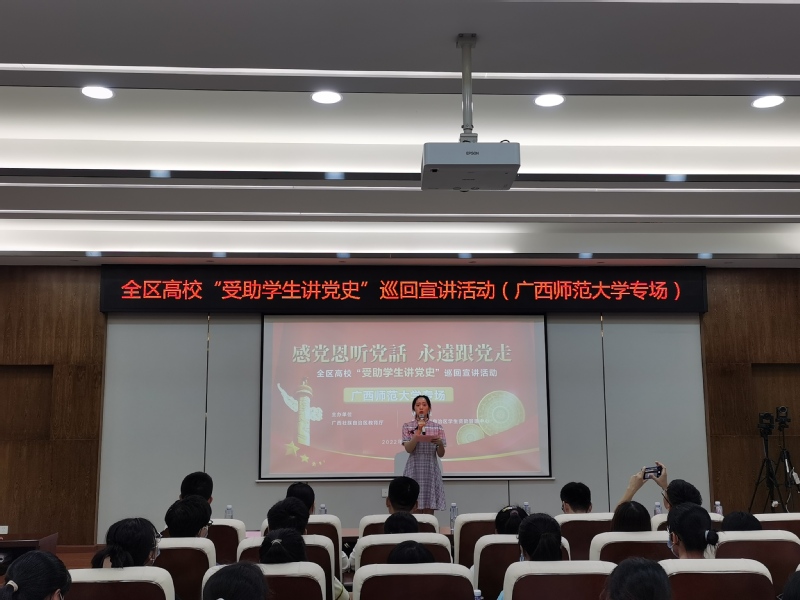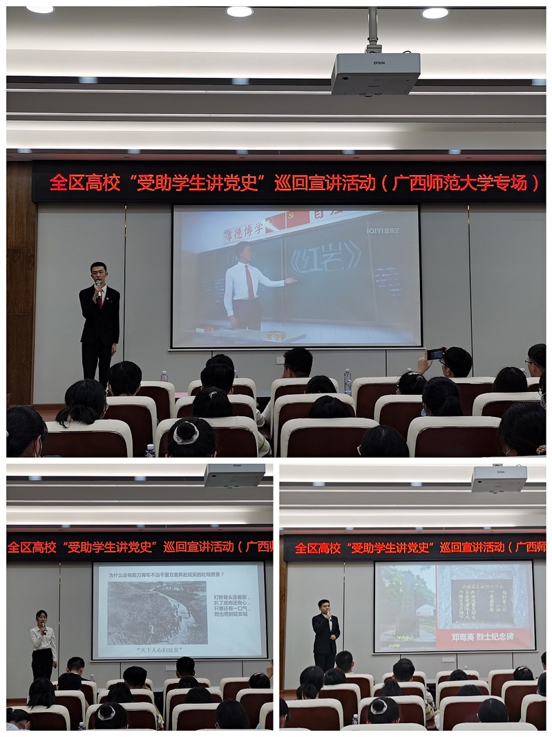 为深入学习贯彻习近平总书记在庆祝中国共产党成立100周年大会上的重要讲话精神,进一步创新资助育人方式,深入推进受助学生党史学习教育不断走深走实,6月24日,2022年全区高校“受助学生讲党史”巡回宣讲活动(广西师范大学专场)在雁山校区举行。自治区高校“受助学生讲党史”宣讲团成员进行现场宣讲,曾获得资助的学生代表及学校学生资助管理中心工作人员200余人到场聆听。