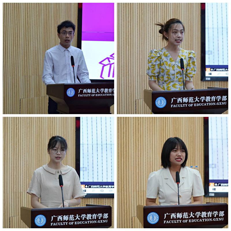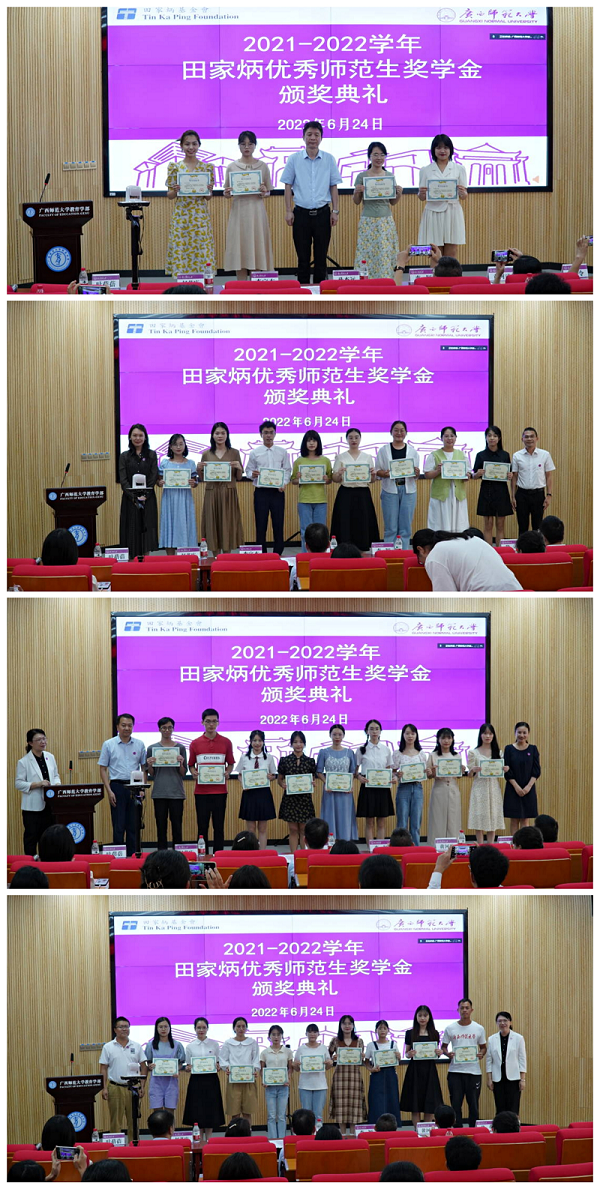 与会领导及嘉宾分别为获得2021-2022学年田家炳优秀师范生的学生颁发证书。来自化学与药学学院的韦兰丽、教育学部的翁玉琼、外国语学院(独秀班)的佘婧、职业技术师范学院的陶前等四位学生作为获奖代表进行发言,表达了他们感恩于田家炳先生无私奉献精神和教育情怀并受到无限鼓舞、投身教育事业的坚定决心。