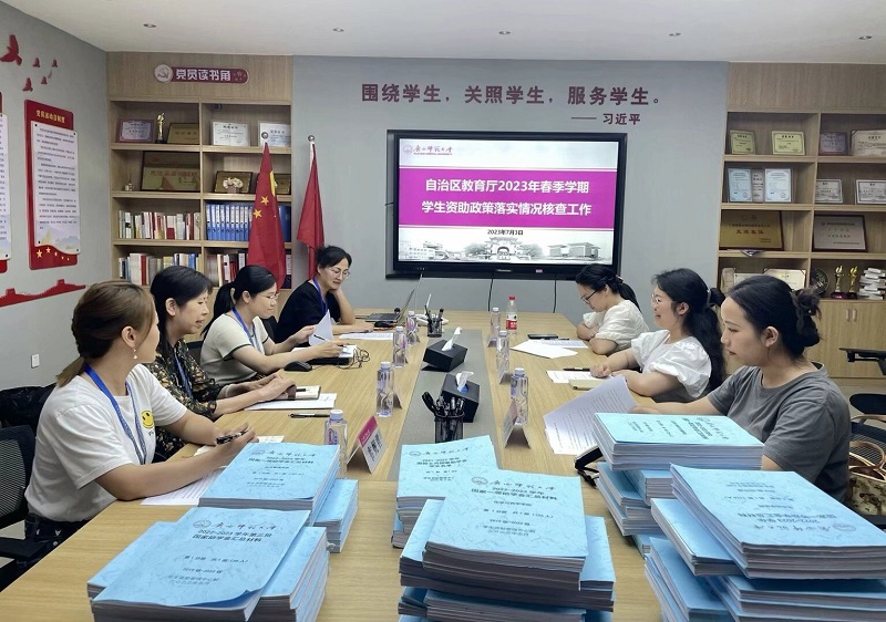为准确掌握我校2023年春季学期学生资助政策落实情况,推动我校学生资助各项工作落实落地,确保家庭经济困难学生及时足额享受资助,根据自治区教育厅工作安排,桂林医学院等高校的相关人员组成核查工作组,于7月3日下午到我校检查学生资助工作开展情况。我校学生工作部(处)学生资助管理中心全体工作人员陪同。