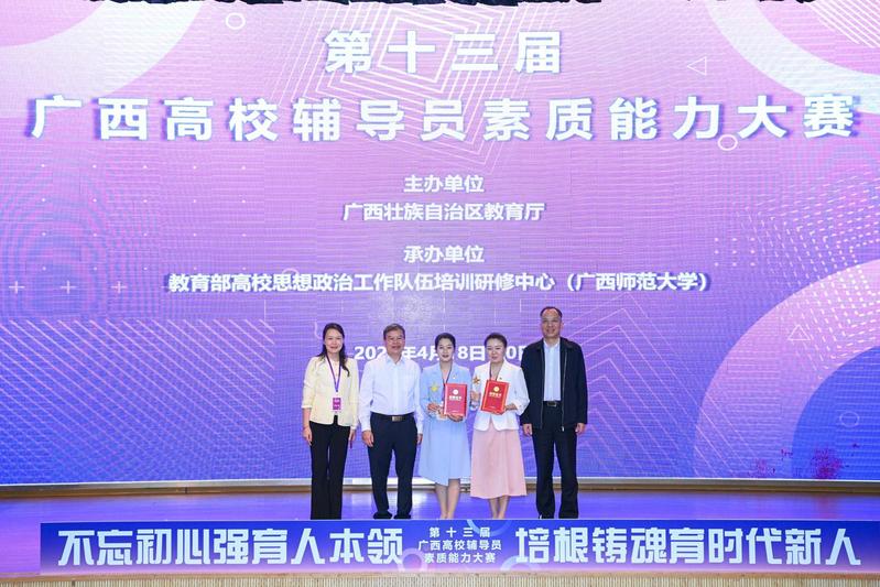 4月18-20日,由广西壮族自治区教育厅主办,教育部高校思想政治工作队伍培训研修中心(广西师范大学)承办的第十三届广西高校辅导员素质能力大赛在我校顺利闭幕。经过激烈角逐,我校法学院/律师学院辅导员吴纬、音乐学院辅导员游晶晶分别荣获第十三届广西高校辅导员素质能力大赛特等奖第一名、第二名,基础知识测试最佳表现奖。