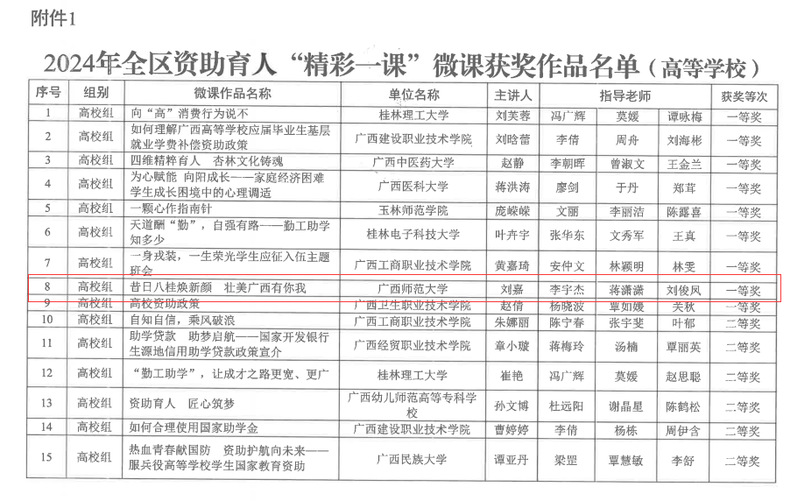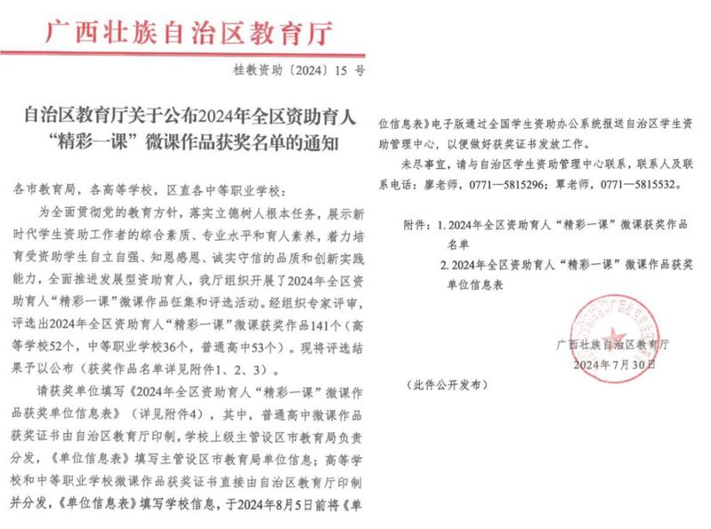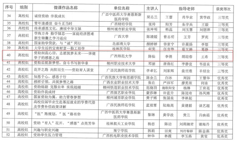 为全面贯彻党的教育方针,落实立德树人根本任务,展示我校新时代资助工作者整体素质、专业水平和育人素养,着力培养受助学生自立自强、知恩感恩、诚实守信的品质和创新实践能力,全面推进发展型资助育人,我校认真组织遴选微课作品参加全区资助育人“精彩一课”微课作品评选工作,报送学生工作部(处)刘嘉老师的微课《昔日八桂焕新颜 壮美广西有你我》和体育与健康学院陈仙老师的微课《资助润我心田,志愿筑梦未来--体健学子的感恩之旅》分获一等奖、三等奖。