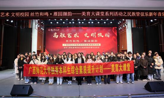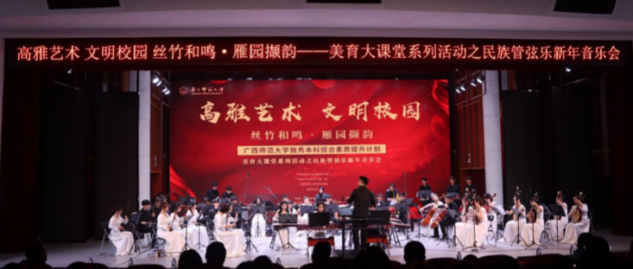 12月23日晚,由广西师范大学音乐学院主办、校党委宣传部、学生工作部(处)协办的“高雅艺术·文明校园”广西师范大学独秀本科生综合素质提升计划—美育大课堂系列活动之民族管弦乐新年音乐会在雁山校区音乐学院三楼演艺厅顺利开展。校学生工作部(处)、音乐学院等有关部门负责人,以及各学院(部)家庭经济困难本科学生代表合计500余人参加了本次活动。